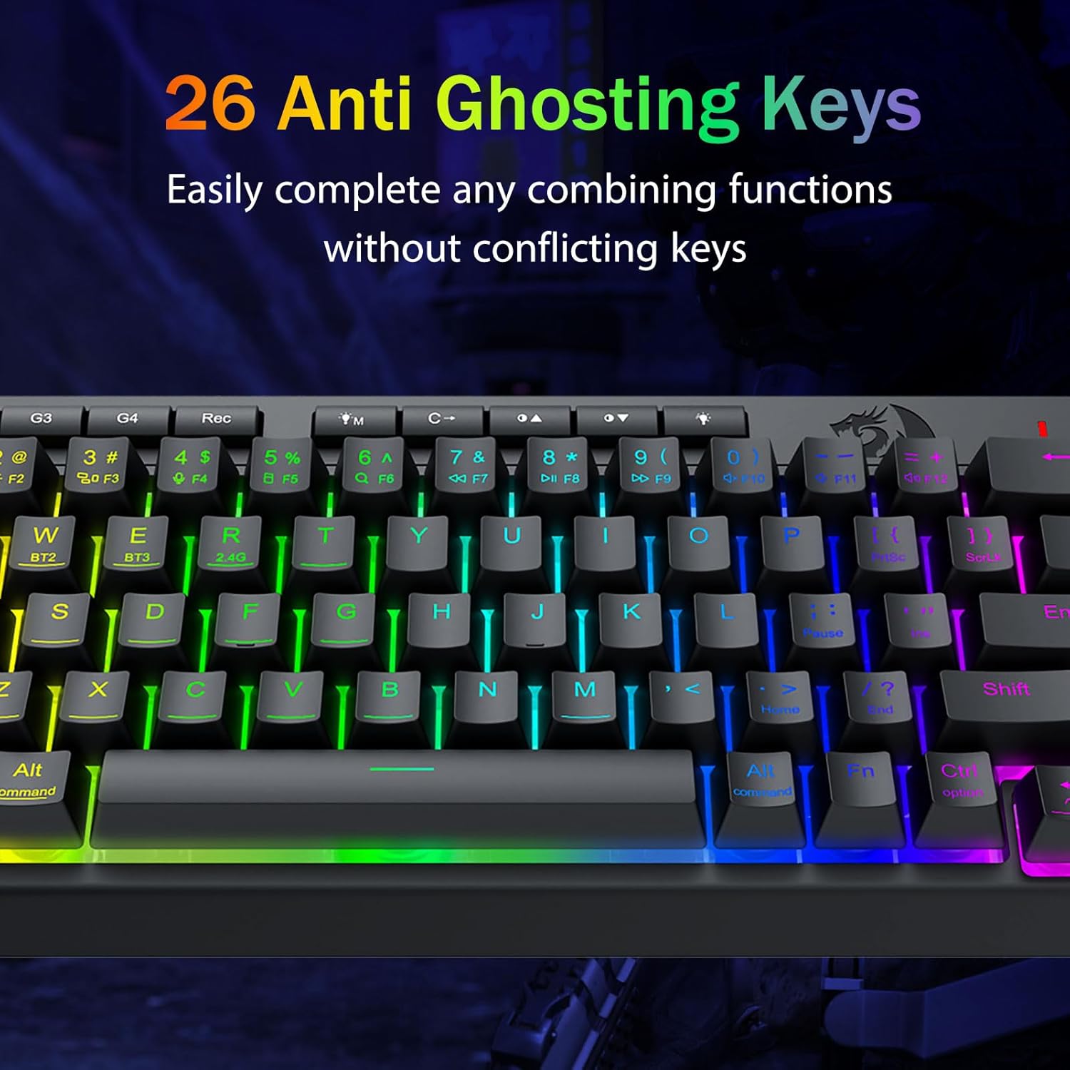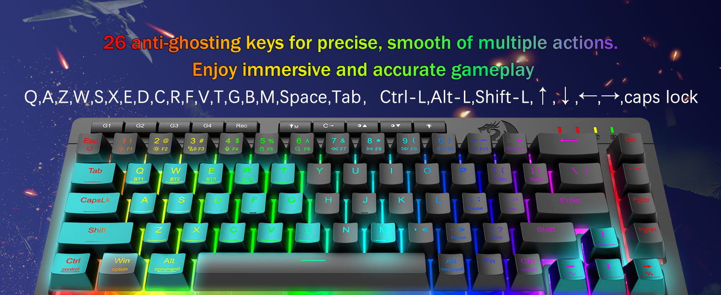 دارای کلیدهای ضد شبح (کلیدهایی با خط زیر) که به 26 کلید اجازه می دهد تا به طور همزمان برای پاسخ سریع و دقیق بازی به روشی که مد نظر شماست کار کنند. دکمه های دسترسی سریع برای روشنایی، حالت روشنایی و حالت بازی برای تنظیم سریع روشنایی، پروفایل های نور و فعال کردن حالت بازی با لمس یک دکمه.