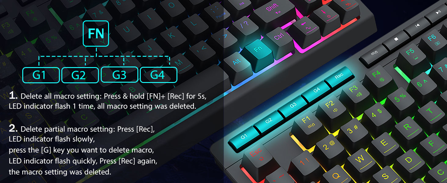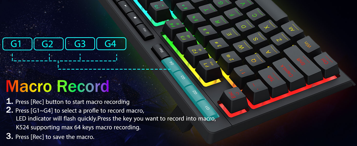 4 کلید ماکرو داخلی -4 کلید ماکرو داخلی (G1~G4) قابل برنامه ریزی هستند و بدون هیچ نرم افزار اضافی در حال کار هستند. کلیدها به راحتی قابل ویرایش هستند و می توانند ماکروهای مختلفی را انجام دهند.
