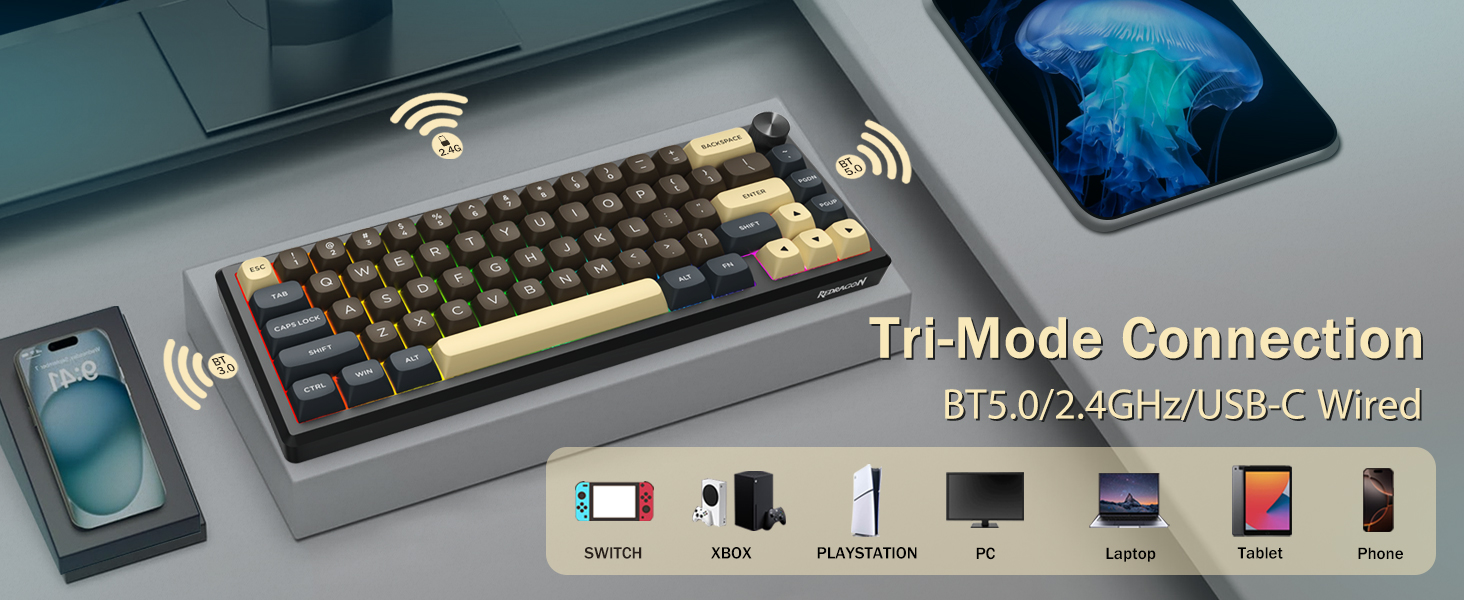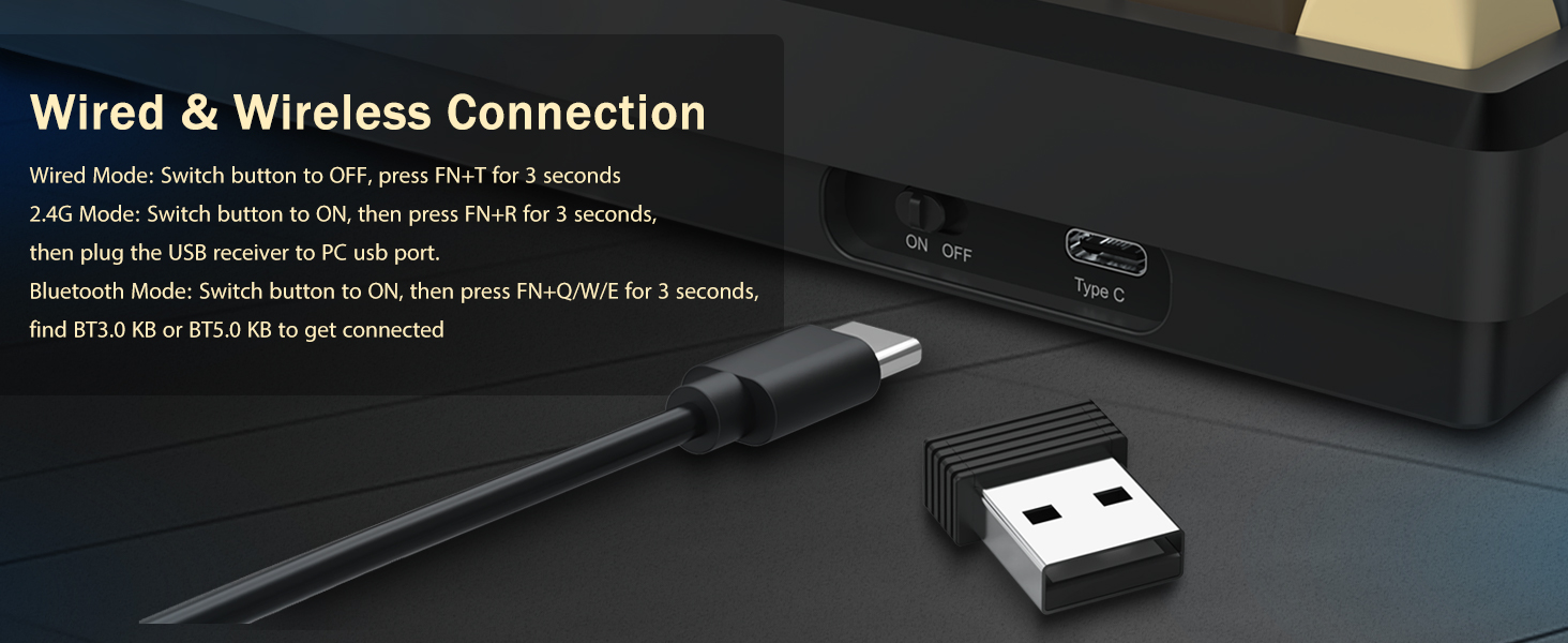 صفحه کلید از اتصال بی سیم برای راحتی و اتصال USB سیمی برای عملکرد پایدار پشتیبانی می کند. کاربران می توانند بسته به تنظیمات خود بین حالت ها جابجا شوند.