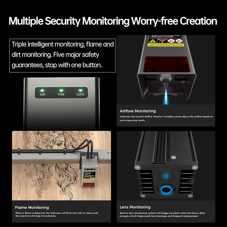 · ❤️ طراحی بسته با قدرت برش فوق العاده:حکاکی Creality Falcon2 Pro 22W با سنسورهای دوگانه، نشان دهنده وضعیت آب بندی، توقف درب، هشدارهای نور هشدار خلاقیت ایمن تری را تضمین می کند، که می تواند تخته چوب باسس 10 میلی متری را با یک پاس برش دهد. با کمک هوای یکپارچه، که می تواند جریان هوا را به صورت خودکار یا دستی برای ایجاد پروژه های عالی تنظیم کند.