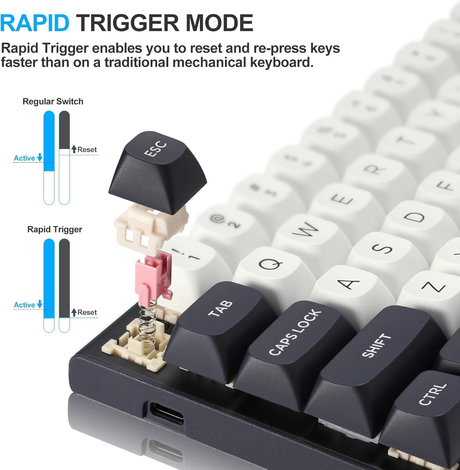 عملکرد ماشه سریع به کلیدها اجازه می دهد تا به جای اینکه منتظر یک نقطه تنظیم مجدد ثابت بمانند، بلافاصله پس از رها شدن، بازنشانی شوند. این امکان ضربه زدن سریعتر کلید و کنترل دقیقتر را فراهم میکند، به ویژه در سناریوهای بازیهای رقابتی مانند FPS یا بازیهای مبتنی بر ریتم مفید است.