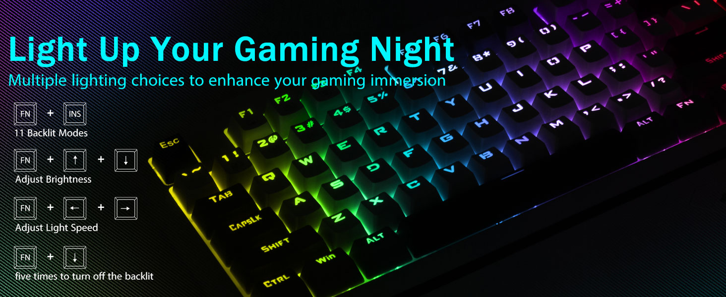 【صفحه کلید رنگین کمان با نور پس زمینه برای تجربه ای همهجانبه】دسکتاپ خود را با 11 حالت نور پس زمینه پویا، 5 سطح قابل تنظیم سرعت و روشنایی روشن کنید. این صفحه کلید یک تغییر دهنده بازی برای تنظیمات بازی شما است و خلق و خو و غوطه وری شما را به خصوص در محیط های کم نور افزایش می دهد. درپوش کلیدهای ABS با تزریق دوگانه بسیار بادوام، نور پس زمینه شفاف و یکنواخت را تضمین می کند و دقت تایپ شما را حتی در تاریکی بهبود می بخشد.