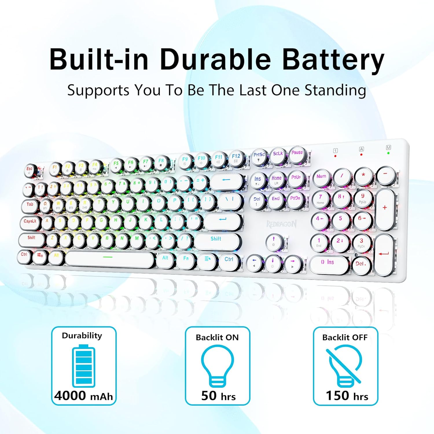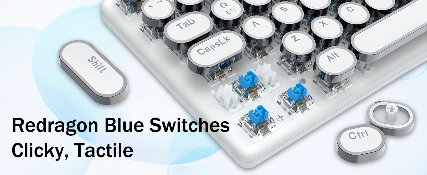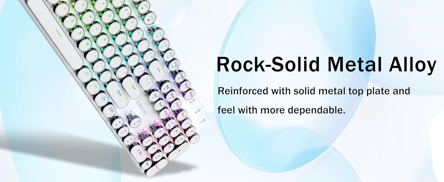 𝗥𝗲𝘁𝗿𝗼 𝗧𝘆𝗽𝗲𝘄𝗿𝗶𝘁𝗲 𝗠𝗲𝗰𝗵𝗮𝗻𝗶𝗰𝗮𝗹 𝗞𝗲𝘆𝘀- سوئیچ های آبی مکانیکی Redragon مقاومت متوسط، صدای کلیک قابل شنیدن و بازخورد لمسی را ارائه می دهند، محیط بازی و عملکرد دقیق و پاسخگو را ارائه می دهند. کلاهکهای گرد صفحهکلید steampunk قدیمی شبیه یک ماشین تحریر کلاسیک هستند، تایپ راحت و لمس پایدار را برای شما به ارمغان میآورند.