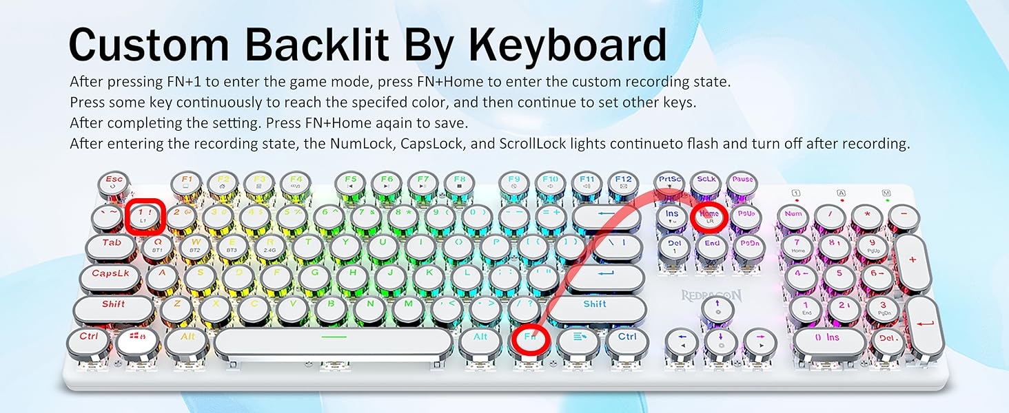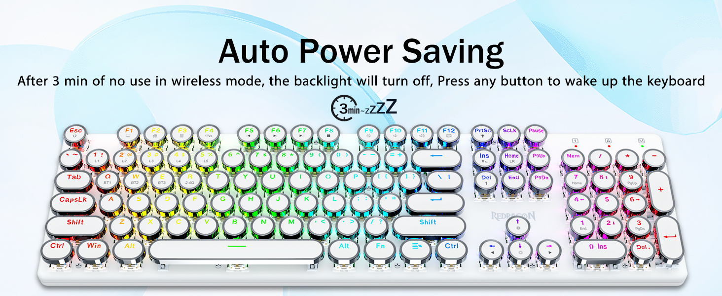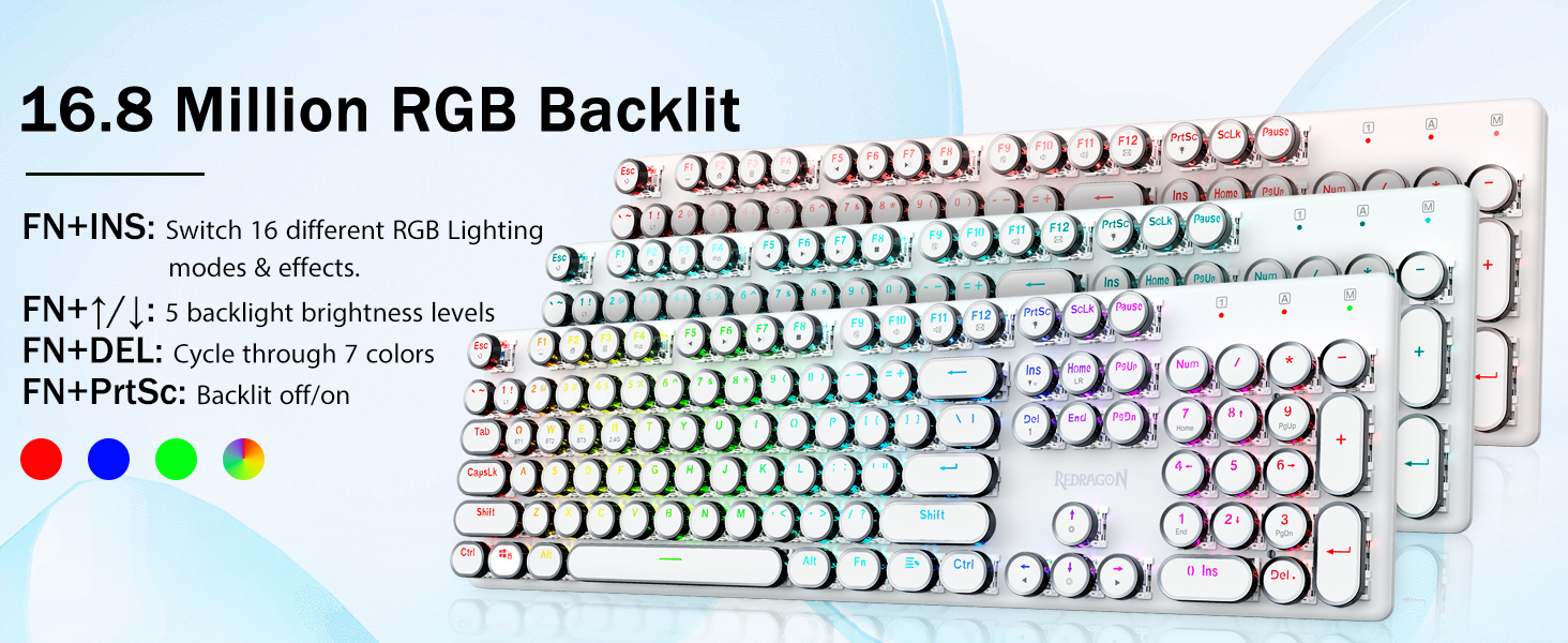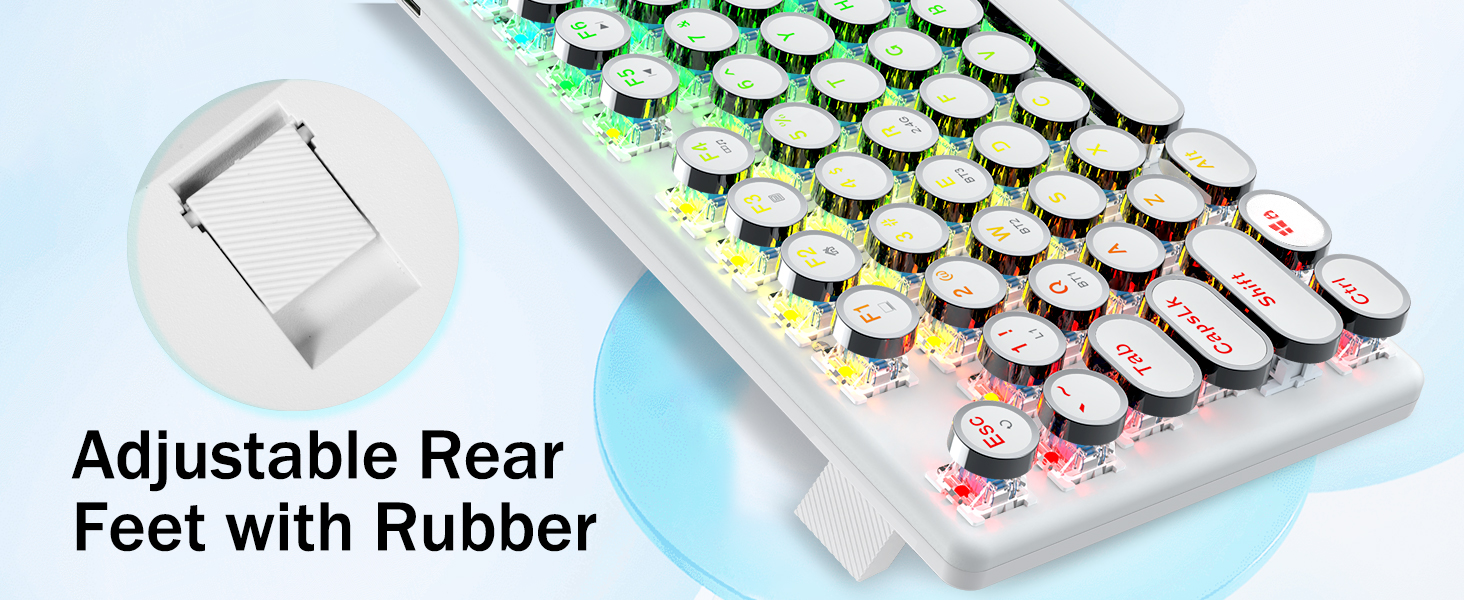 𝗥𝗲𝘁𝗿𝗼 𝗧𝘆𝗽𝗲𝘄𝗿𝗶𝘁𝗲 𝗠𝗲𝗰𝗵𝗮𝗻𝗶𝗰𝗮𝗹 𝗞𝗲𝘆𝘀- سوئیچ های آبی مکانیکی Redragon مقاومت متوسط، صدای کلیک قابل شنیدن و بازخورد لمسی را ارائه می دهند، محیط بازی و عملکرد دقیق و پاسخگو را ارائه می دهند. کلاهکهای گرد صفحهکلید steampunk قدیمی شبیه یک ماشین تحریر کلاسیک هستند، تایپ راحت و لمس پایدار را برای شما به ارمغان میآورند.