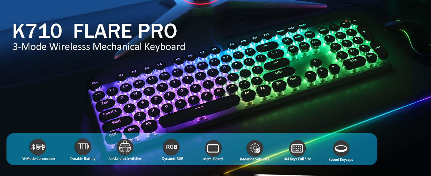 𝗗𝗲𝗽𝗲𝗻𝗱𝗮𝗯𝗹𝗲 𝗠𝗲𝘁𝗮𝗹 𝗣 𝗔𝗻𝘁𝗶 𝗚𝗵𝗼𝘀𝘁𝗶𝗻𝗴- نسخه ارتقا یافته FLARE PRO از همان مواد فلزی جامد مخزن استفاده می کند. صفحه کلید را ثابت و زیبا روی میز نگه دارید تا تجربه تایپ ممتازی داشته باشید. صفحه کلید K710 از فناوری ضد شبح 104 کلیدی پشتیبانی می کند و به شما امکان می دهد چندین کلید را همزمان بدون درگیری فشار دهید.