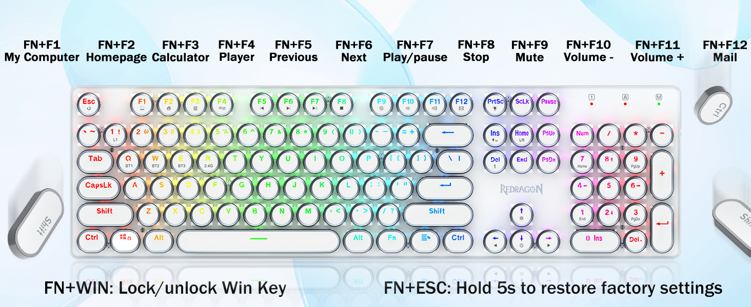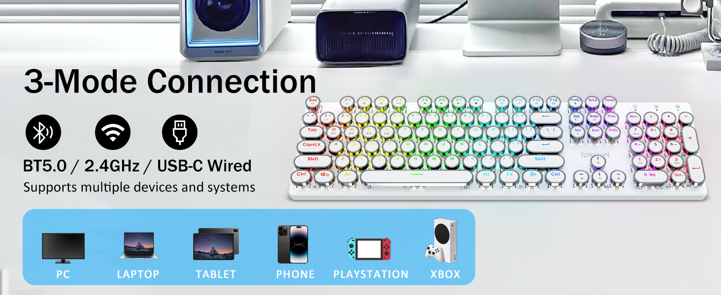 𝟯-𝗠𝗼𝗱𝗲 𝗖𝗼𝗻𝗻𝗲𝗰𝘁𝗶𝗼𝗻- مجهز به فناوری اتصال سه حالته نوآورانه Redragon، با سیم USB-C، حالت های بی سیم بلوتوث 3.0/5.0 و 2.4Ghz که باعث می شود تجربه کاربر در همه زمینه ها به سطح دیگری ارتقا یابد. FN+Q/W/E را به حالت بلوتوث فشار دهید، FN+R را به حالت 2.4G فشار دهید.