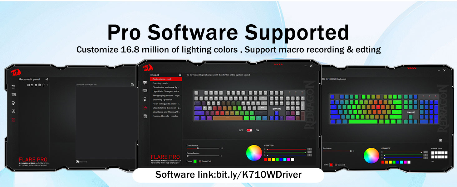 𝗣𝗿𝗼 𝗦𝗼𝗳𝘁𝘄𝗮𝗿𝗲 𝗦𝘂𝗽- گزینه های خود را با استفاده از نرم افزار موجود برای طراحی حالت ها و افکت های جدید خود گسترش دهید. ماکروها با کلیدهای مختلف یا میانبر برای کار و بازی کارآمدتر. لینک نرم افزار: bit.ly/K710WDriver.